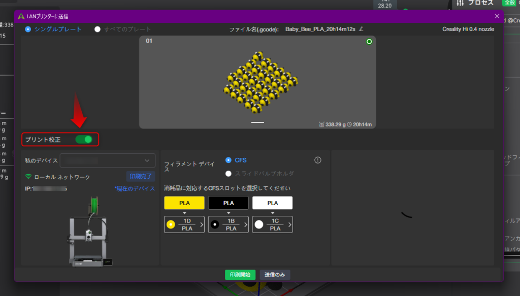 プリント毎に設定をオンにしておけばビルドプレートを変えたりノズルを交換しても安心して印刷が可能です。