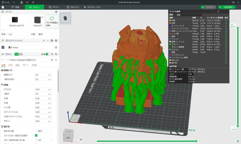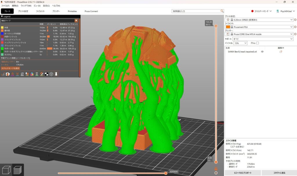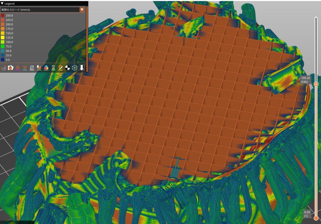 個人的に好きなポイントは3Dプリントされた後、条件はよさそうだしフィラメントは乾燥したはずなのに表面が一部おかしかったりする際はスライサー上の実際のスピードやファンの速度の表示で実物と見比べてみると原因がわかる場合があります。一部だけ表面があれているのはそこで冷却が足りなかったり早すぎたり。実際の印刷速度の表示は特にPrusa Slicerならではの機能ですね。