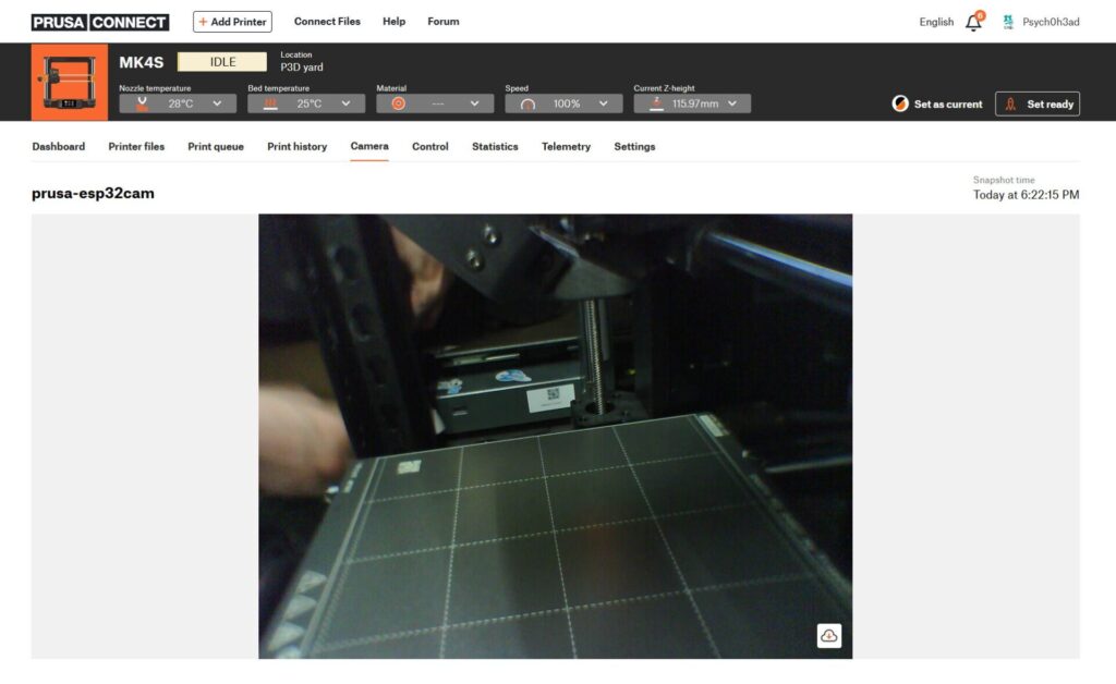 カメラが必要な場合はPrusa側で対応しているESP32系の無線カメラモジュールを公開しているのでセットアップしてつなげてあげる感じです。