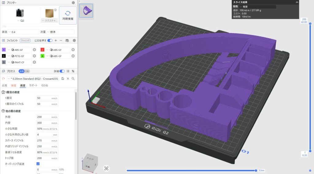 個人的にはPLAで使うよりもエンプラでゴリゴリ使って楽しい機体かなと思ったので418時間のうちのほとんどはQIDI純正のABS-GF25フィラメントを使用しました。今までできなかったGF/CF系でマルチカラー印刷ができて楽しい一台です。