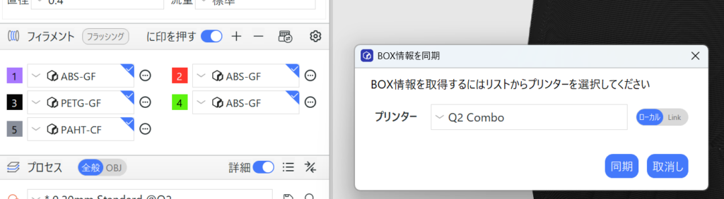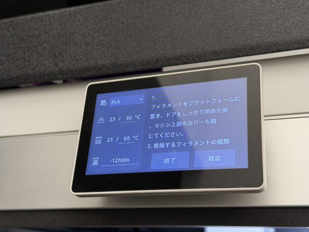 印刷前は開封直後だとしてもまずはQIDI BOXを使って乾燥させてから使用しましょう。またQIDIからの推奨でCF/GFなどの強化繊維系はQIDI BOXを乾燥時と同じ温度に設定して印刷してくださいとのこと。常温よりもフィラメントが柔らかくなり途中で折れてしまうのを防ぐ目的かなと思います。