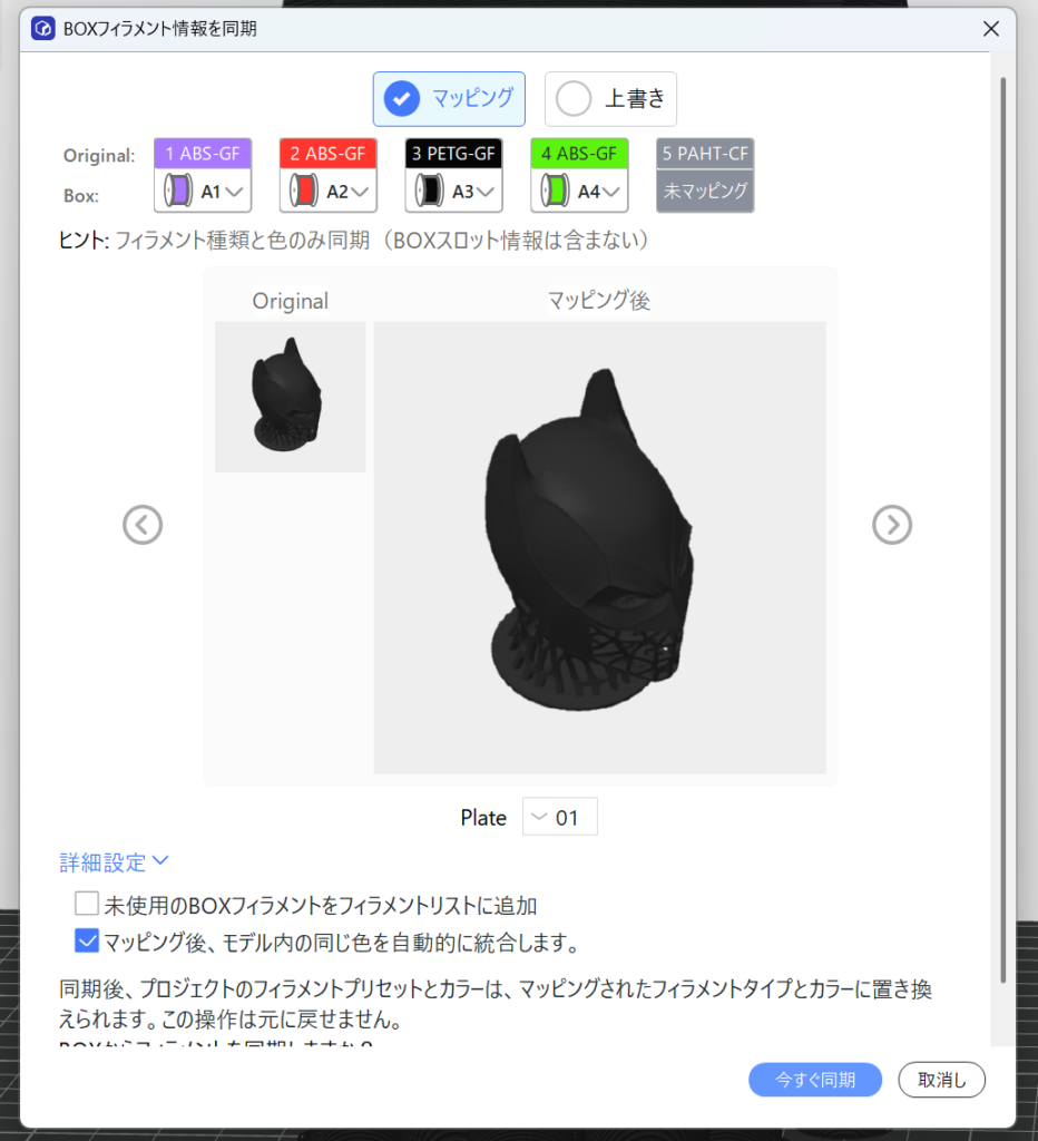 またQIDI BOXでUnload時に巻き取りすぎてしまうところはちょっとソフト側で改善してフィラメントが完全に巻き取られる手前で止めて手動で抜く仕様にしてほしいなと感じました。こちらはQIDIにFB済みです。