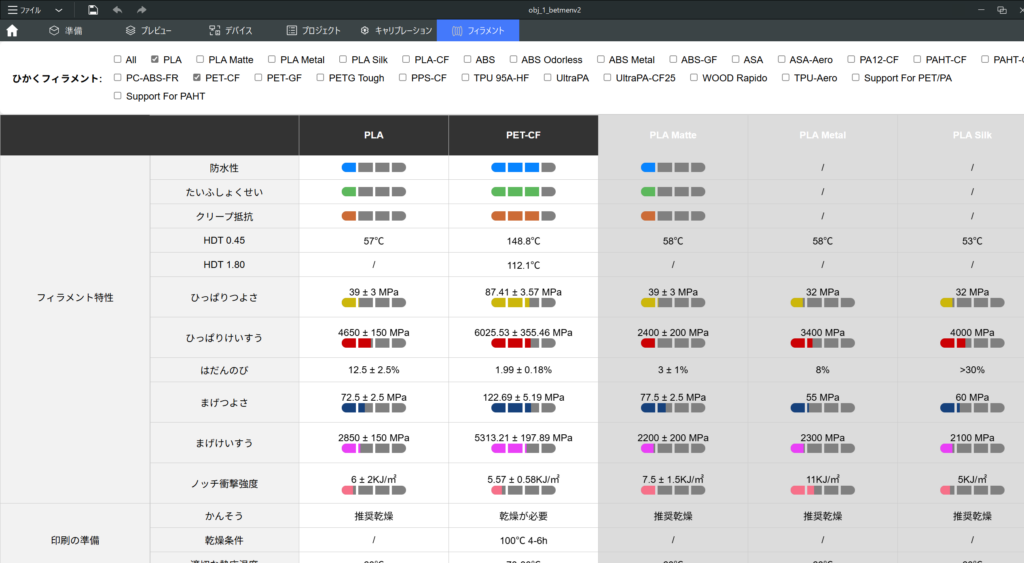 フィラメントの比較なんていう便利機能も!こちらは日本語がちょっとおかしかったのでGitHubでプルリクを投げておきました。