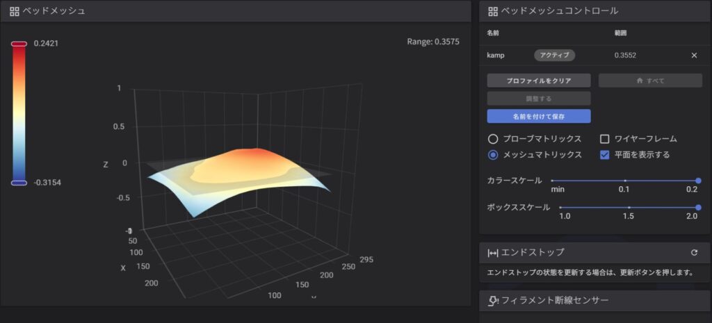 Platform Caliblation機能を使って傾きを更に補正は可能です。ノブは結構硬めというかノブが小さいので回しにくいという感じですね。普段使う素材の温度までベッド温度を上げた後にベッドメッシュを行い結果に従って調整していく感じです。この程度であれば小物の印刷では特段問題ないですが組み合わせ前提の大型部品の場合や底面と上面ないしどこかの並行が重要な場合は調整をおすすめします。