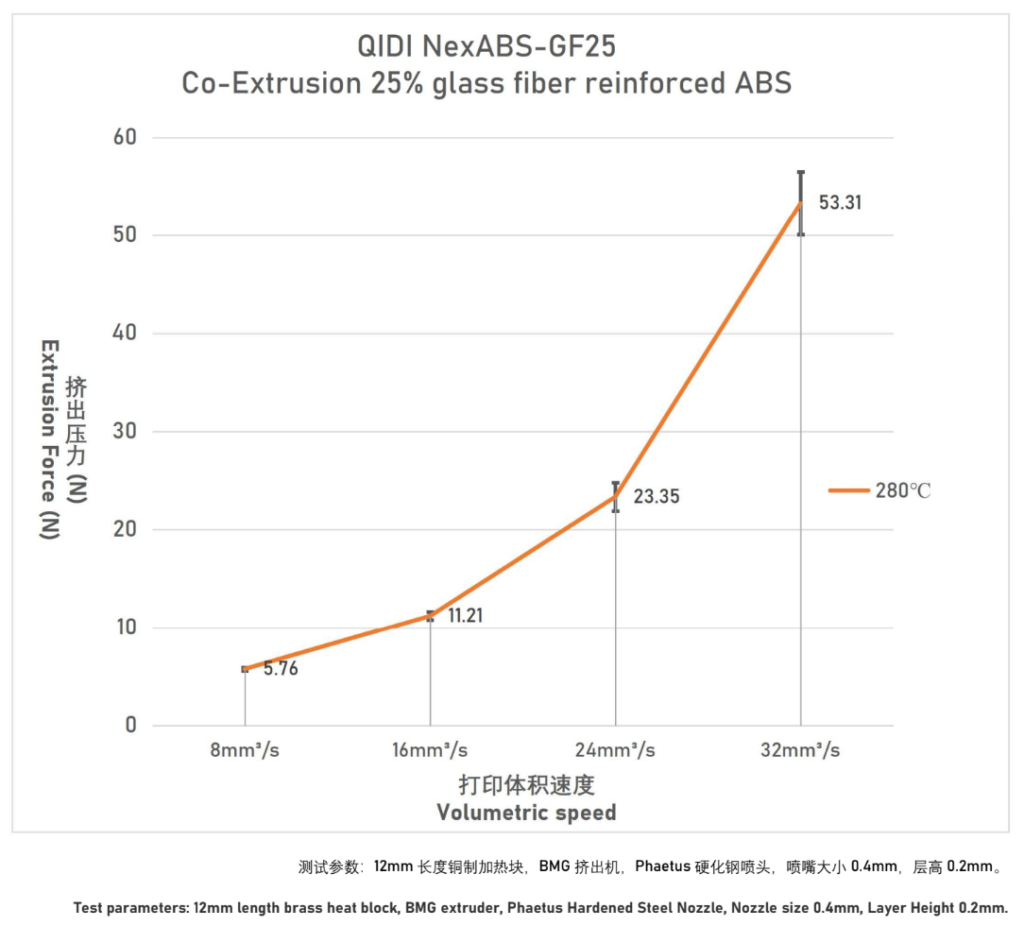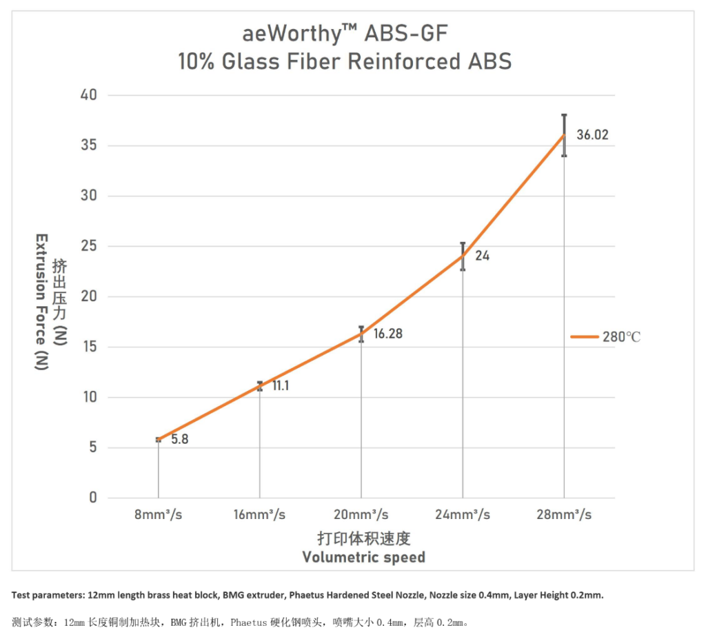 QIDIのものは25%GF配合に対してPhaetus aeWorthyは10%。ちょっとTDSを見てみましたが残念ながら微妙に条件が違い比較はできなそうです。通常系のABSでも同様の比較をしてくれていると比較しやすそうですが。同様に温度x押出圧力のグラフも見てみたいですね。