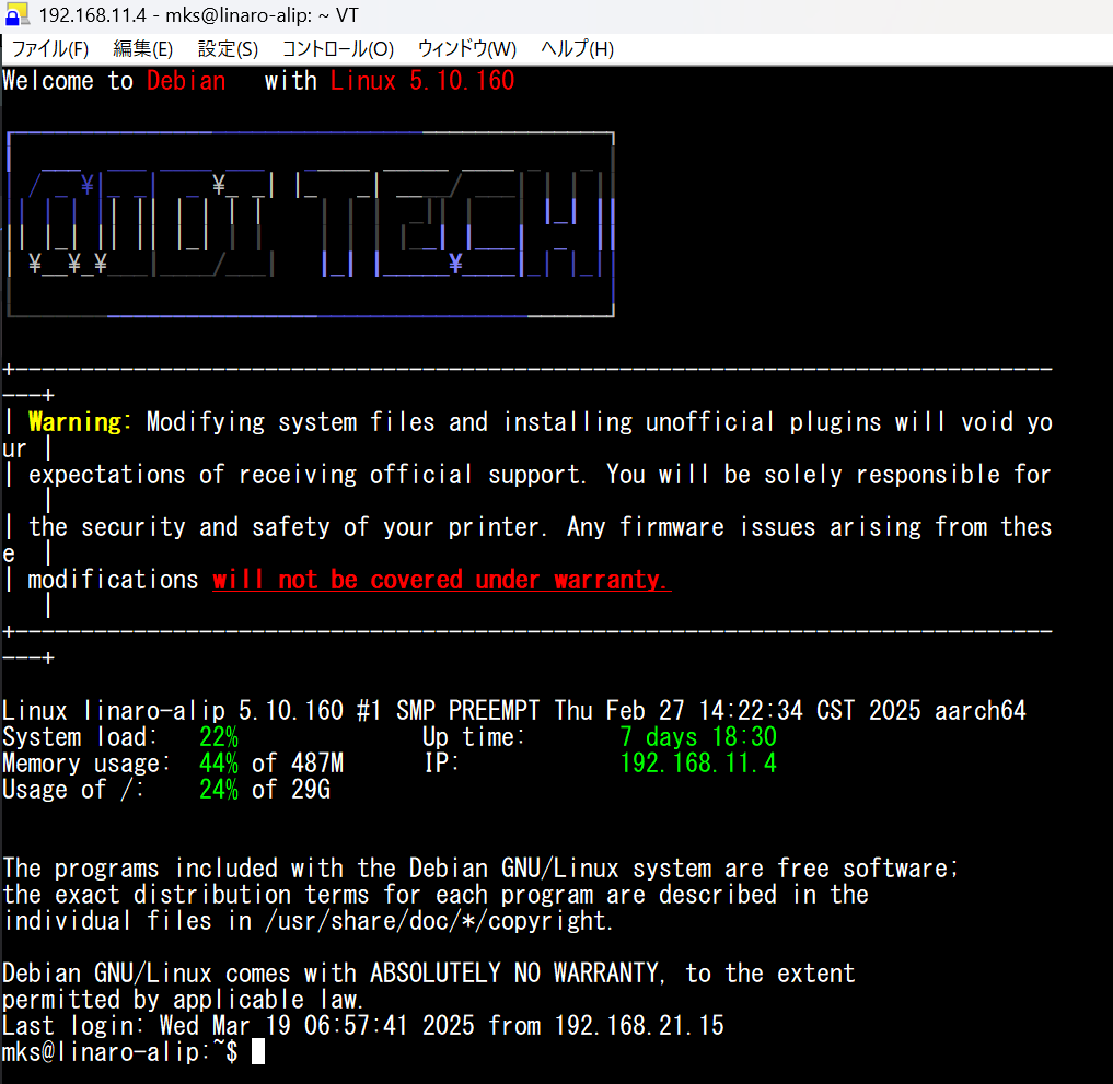 “警告: システムファイルの変更や非公式プラグインのインストールは、公式サポートを受ける期待を無効にします。プリンターのセキュリティと安全性については、お客様が単独で責任を負うことになります。これらの変更から生じるファームウェアの問題は、保証の対象外となります。”